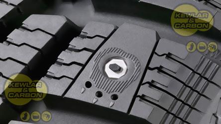 The bear claw boosts stud operating effectiveness. The front edge of the tread blocks features a sharp-edged, claw-like projection circled by siping, which pre-tightens and supports the stud. The sharp end of the square-shaped hard metal pin always points in the driving direction, ensuring excellent ice grip and lateral stability. The stud does not twist or give way, improving surface grip particularly in the shoulder area which is most critical to maximize braking capabilities.